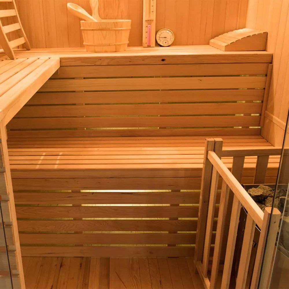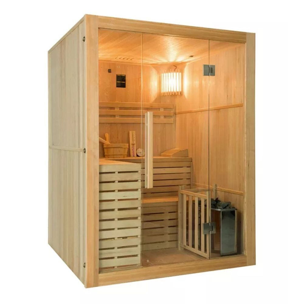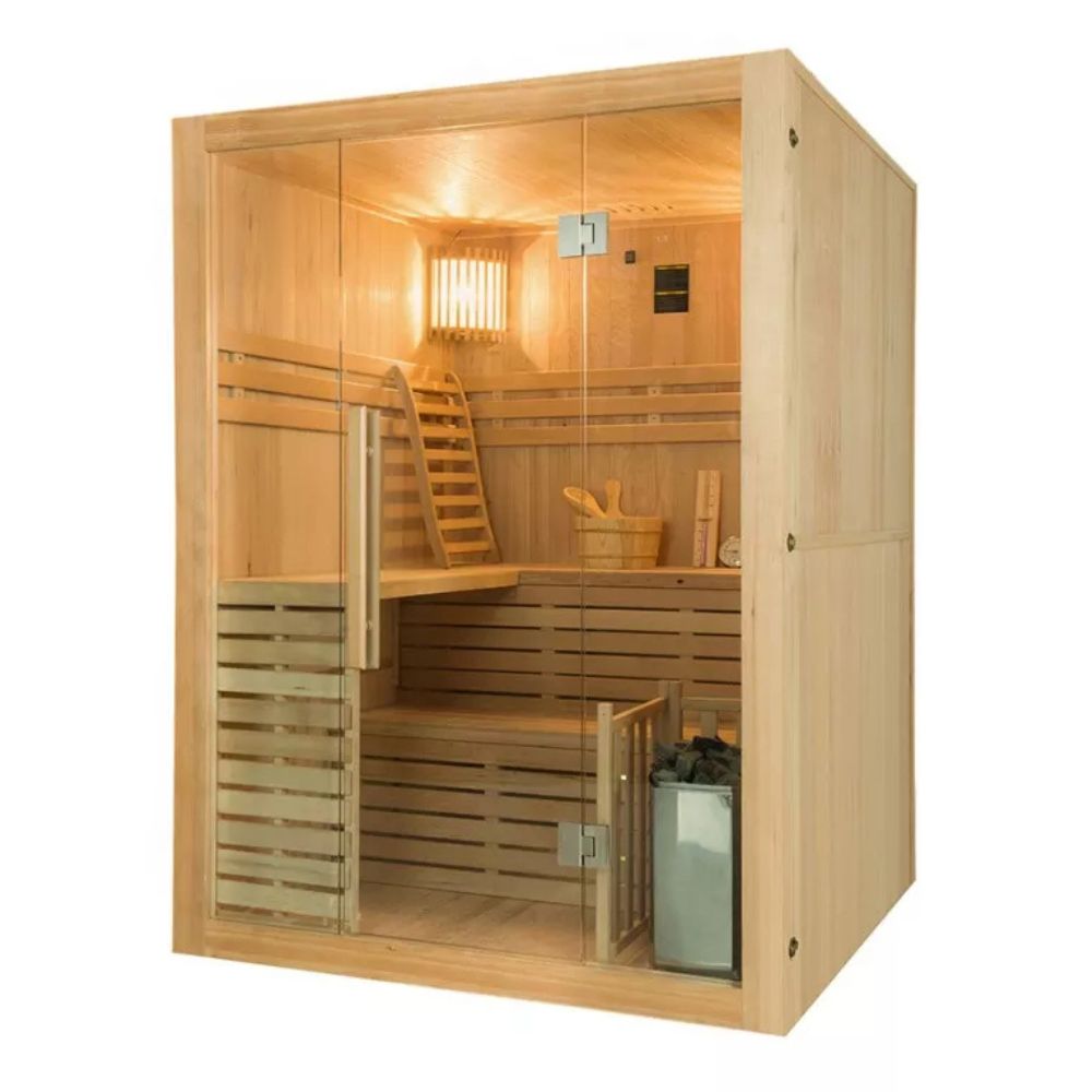 La sauna Eva è il riflesso del know-how che unisce tutti gli elementi favorevoli all’evasione della mente e al rilassamento del corpo. La stufa di questa sauna a vapore apporta il calore necessario ai benefici della sauna tradizionale. Le classiche lampade posizionate negli angoli in alto alla cabina e sotto la panca creano un’atmosfera distensiva, mentre l’ampia superficie vetrata offre una sensazione di apertura. Comodamente appoggiati o allungati, trovate la posizione ideale per rilassare il vostro corpo e la vostra mente in questa sauna tradizionale in abete rosso del Canada. La sauna Eva è dotata di stufa finlandese Harvia con pietre di lava, nonché del tradizionale kit sauna (secchiello e mestolo in legno, termometro, igrometro, clessidra tradizionale).