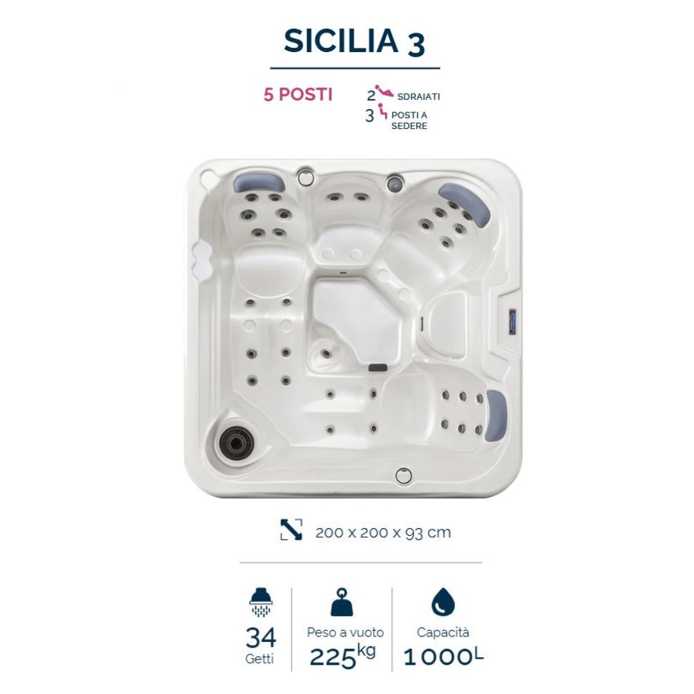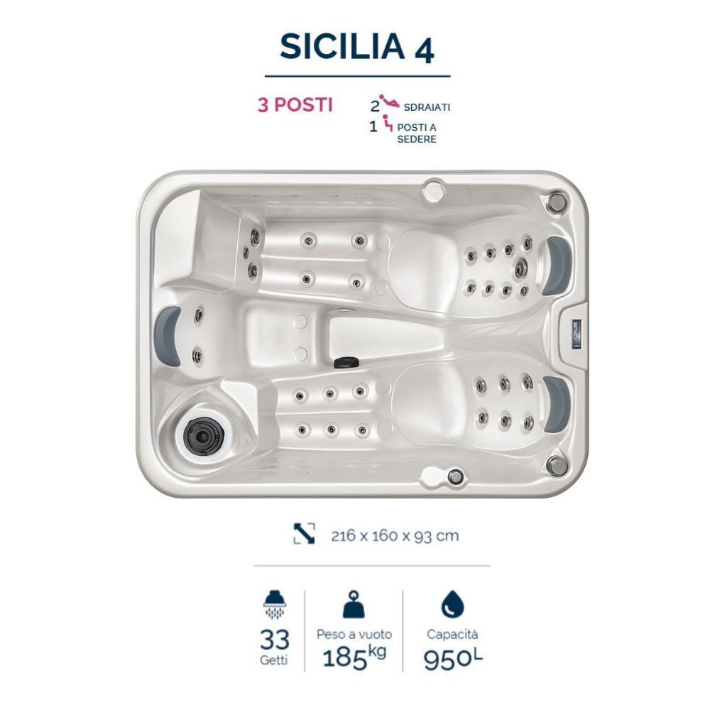 La spa Sicilia è la scelta ideale per chi cerca relax e comfort in ogni stagione. Con le sue linee arrotondate e i suoi 5 posti (4 sedute ergonomiche + 1 chaise longue), offre massaggi mirati grazie ai getti idromassaggio CMP® in acciaio inox.